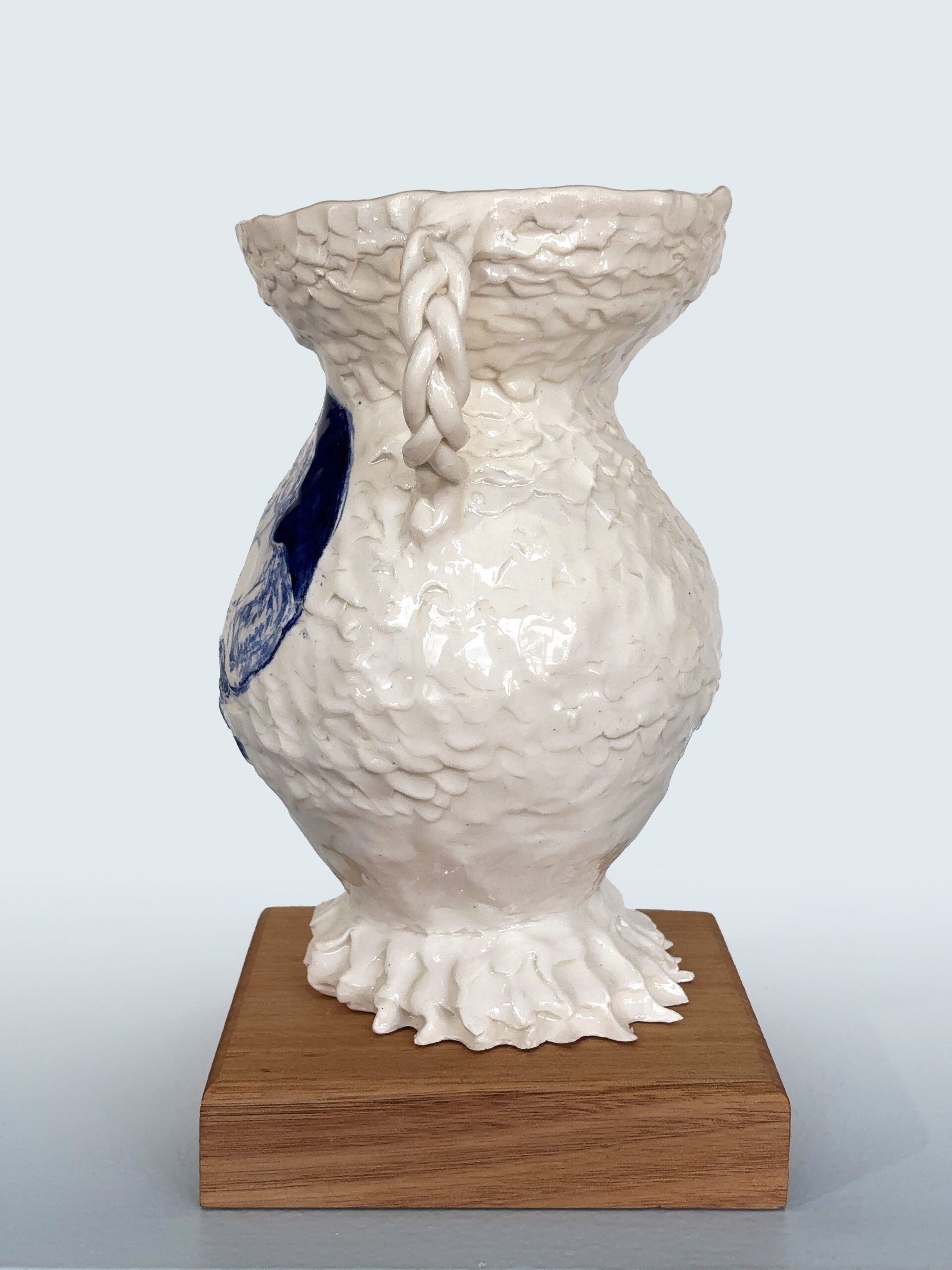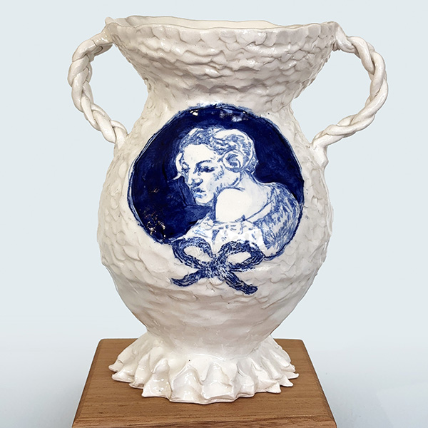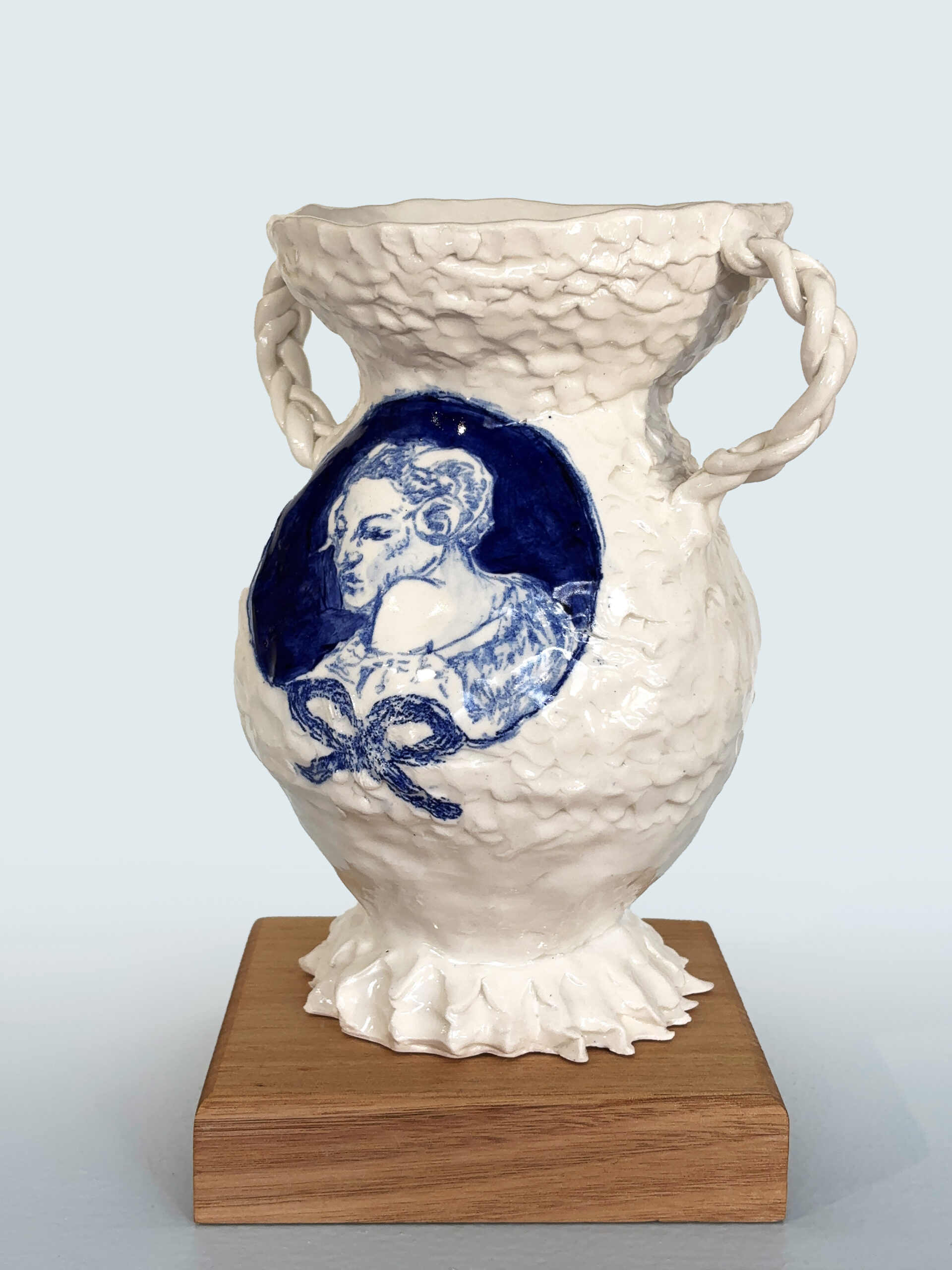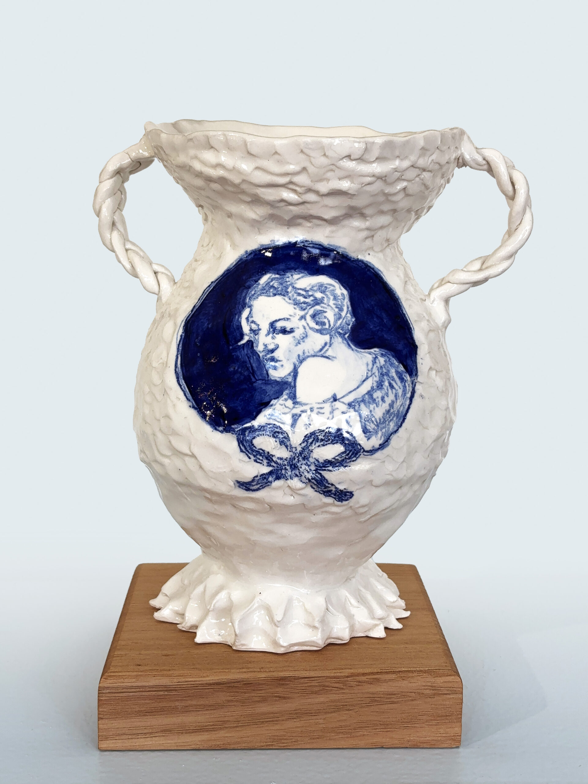 Hand-Coiled Porcelain vessel, with underglaze pencil drawing of The Jean-Léon Gérôme painting ‘The Bacchante’ and cobalt carbonate detailing.