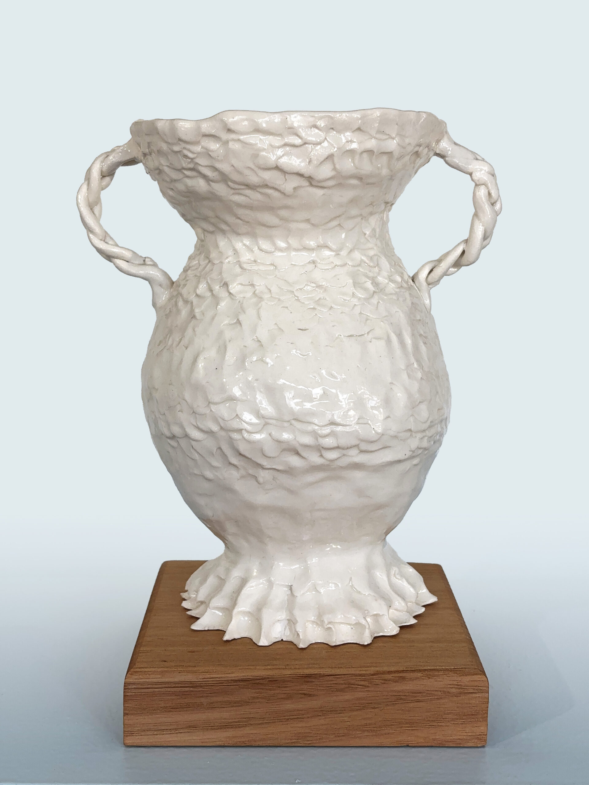 2025, porcelain, glaze, comes with an artist-made timber stand in Mountain Ash