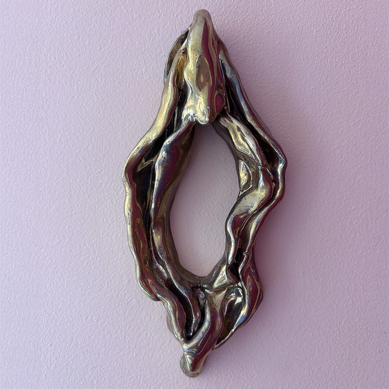 2025, Midfire ceramic, glaze, 24k gold lustre, epoxy resin, D-rings
